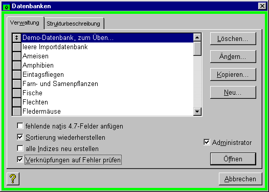 nnatis verwaltet die Daten in Datenbanken, die aus einzelnen Tabellen zusammengestellt werden. Einige Tabellen (z.B. Artenlisten, Gemeindelisten) können parallel in mehreren Datenbanken verwendet werden. Werden in solchen Tabellen Änderungen durchgeführt, gelten sie sofort für alle Datenbanken, die diese Tabellen benutzen. Die Datenbanken werden im folgenden Formular verwaltet und geöffnet: