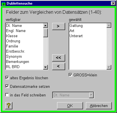 nnatis bietet mehrere Funktionen zur Pflege des Datenbestandes. Eine von ihnen ist die Funktion zum Suchen von Doppeleinträgen in einer Tabelle, die gewöhnlich nach umfangreichen Importen entstehen. Der Benutzer gibt vor, welche Feldinhalte gleich sein müssen, damit die Dubletten als solche erkannt werden (in diesem Fall Gattung, Art und Unterart). Erkannte Dubletten werden gekennzeichnet, so dass sie entsprechend behandelt werden können.