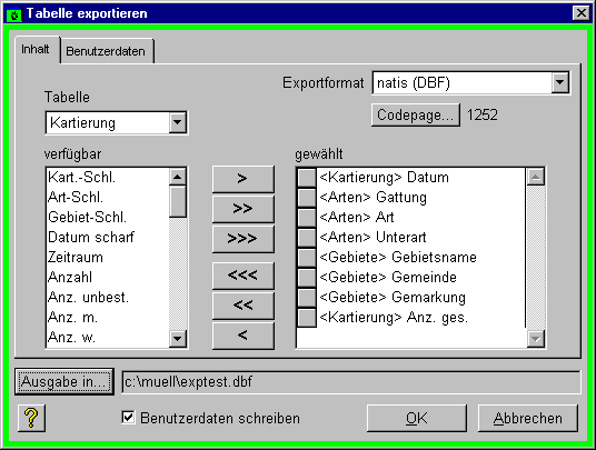 Der Inhalt der aktuellen Tabelle kann in verschiedenen Formaten exportiert werden. Die exportierten Daten können mit anderen nnatis-Anwendern ausgetauscht oder in anderen Programmen verarbeitet (z.B. gedruckt) werden. Beim Export kann die Auswahl und die Reihenfolge der zu exportierenden Felder bestimmt werden. Bei verknüpften Tabellen können auch Felder aus den Referenztabellen zusammen mit den Feldern der aktuellen Tabelle exportiert werden. Der Name der Ursprungstabelle steht vor dem Feldnamen (s. rechte Feldliste).