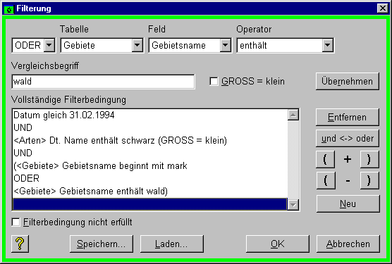 Eine Tabelle kann nach gewählten Kriterien gefiltert werden. Es ist eine für die Auswertung und Pflege des Datenbestandes sehr wichtige Funktion. Die Filterkriterien können in weiten Grenzen vom Benutzer gewählt werden. Es können bis zu 13 Kriterien definiert werden; diese können durch den Einsatz von Klammern zu aufwendigen logischen Bedingungen zusammen gestellt werden. Einmal für Routine-Aufgaben erstellte Filterbedingungen können gespeichert und bei Bedarf wieder eingelesen werden.
