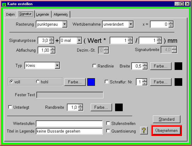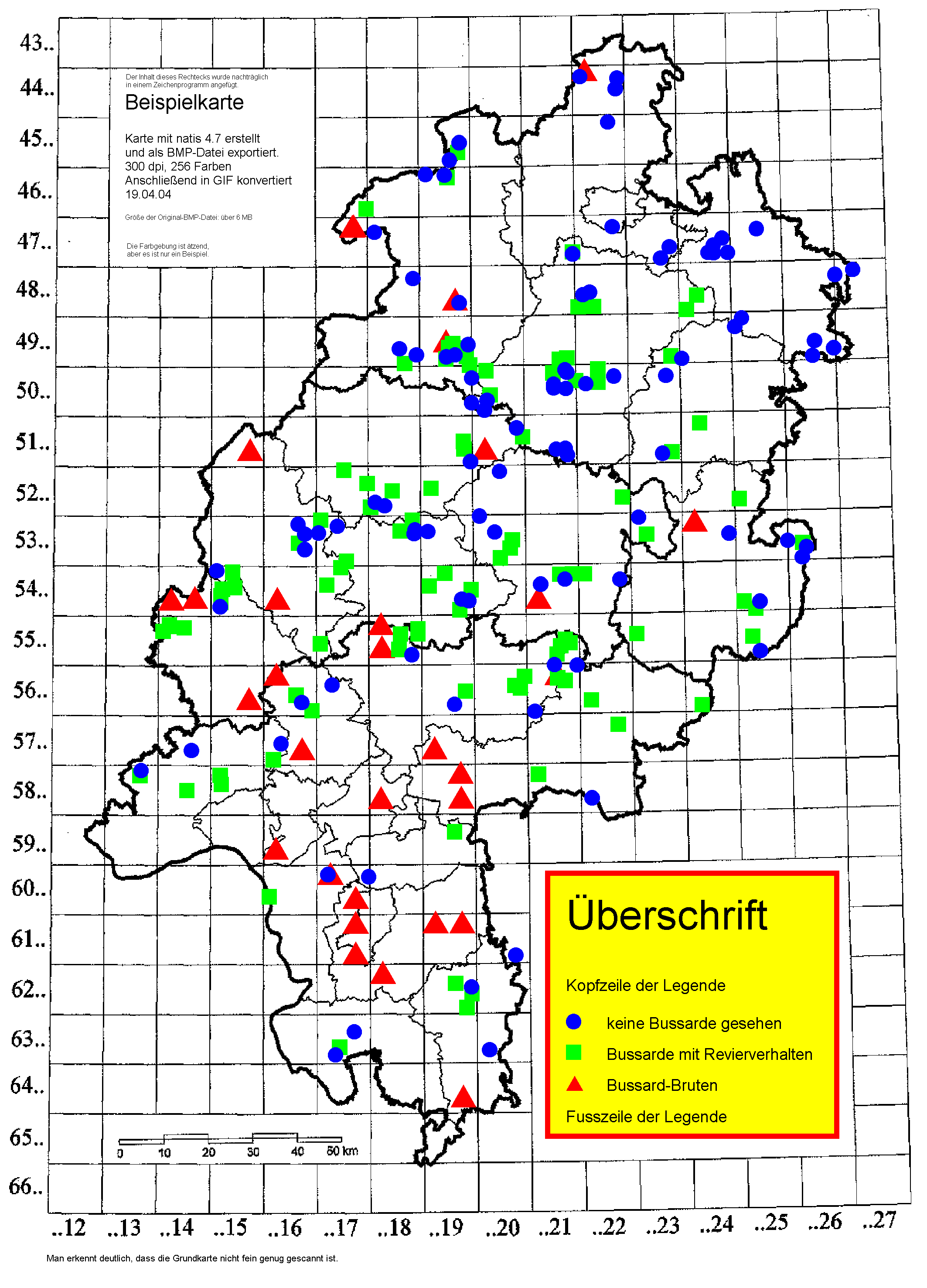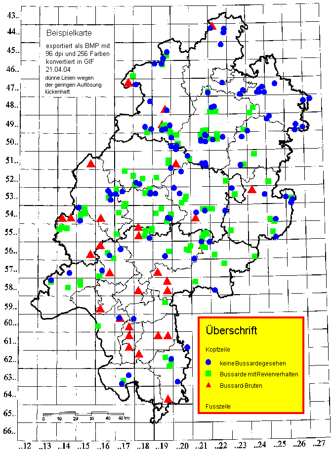 Mit den oben abgebildeten Einstellungen für Karte, Signatur und Legende sowie einigen Beispieldaten wurde eine Verbreitungskarte erstellt. Diese Karte wurde mit der Exportfunktion von nnatis zweifach im BMP-Format mit 256 Farben und verschiedenen Auflösungen ausgegeben. Anschließend wurden die BMP-Dateien ins GIF-Format konvertiert, um die Größe zu verringern.