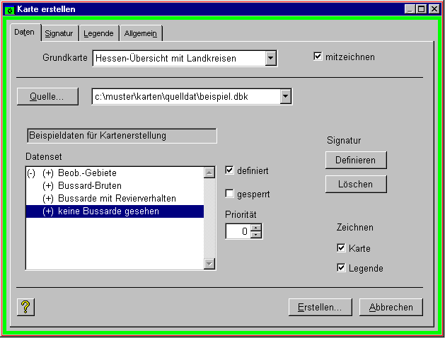Daten einer aktuellen Tabelle (unter Berücksichtigung der Filterung u.ä.) können als ein Datenset in eine Zwischentabelle (Kartenquelldatei) ausgegeben werden. Die Datensets können auch aus verschiedenen Datenbanken stammen und/oder durch verschiedene Filterungen entstanden sein. Der Inhalt einer Kartenquelldatei kann anschließend auf einer Karte dargestellt werden. Dabei kann die Grundkarte unabhängig vom Inhalt der Quelldatei bestimmt werden. Für jedes Datenset kann eine Signaturart (s.unten) definiert werden. Es können beliebig viele verschiedene Datensets in einer Quelldatei gespeichert werden; sie können nachträglich von der Ausgabe ausgeschlossen (gesperrt) werden. Im Beispiel sind 4 Datensets vorhanden; das erste ist gesperrt. Eine automatische Legendenerstellung nach einigen Standard-Layouts ist möglich. Eine Karte ohne Legende kann natürlich auch erstellt werden.