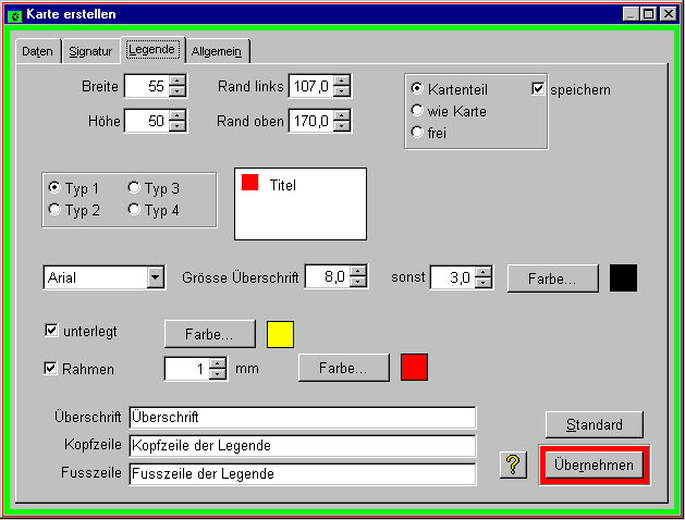 nnatis bietet die Möglichkeit, für eine Karte automatisch eine Legende zu erstellen. Dabei kann eines von mehreren Standard-Layouts verwendet werden. Die Legende kann auch in weiten Grenzen grafisch gestaltet (verunstaltet?) werden. Die Legende kann in eine Karte eingebettet oder getrennt ausgegeben werden. Es kann auch eine Legende ohne Karte erstellt werden.