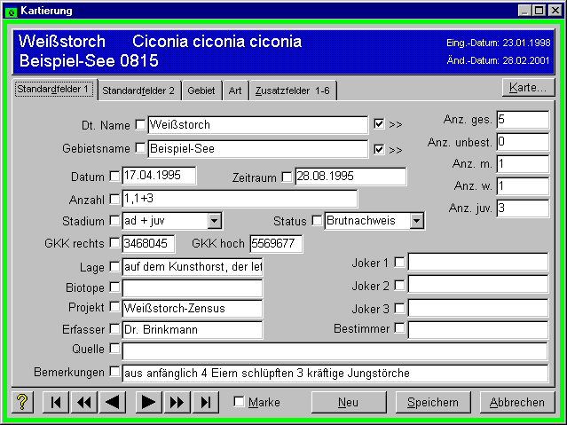 Die Daten werden nicht direkt in Tabellen eingegeben, sondern in Erfassungsformulare. In diesen Formularen werden auch i.d.R. Funktionen integriert, die die Eingabe erleichtern, wie eine automatische Koordinatenumrechnung oder Gesamtanzahl-Berechnung. Die oberen Felder mit Doppelpfeil dahinter dienen zum Verknüpfen der eingegebenen Daten mit den Referenztabellen. Die kleinen Rechtecke vor den Eingabefeldern dienen zum "Einfrieren" der Feldinhalte, die dann nicht jedesmal neu eingegeben werden müssen. Der Knopf "Karte" rechts oben ermöglicht die Eingabe von Koordinaten durch einen Klick in einer Karte. Eingabeformulare sind in Abhängigkeit von Tabellen inhaltlich verschieden, doch ähnlich aufgebaut.